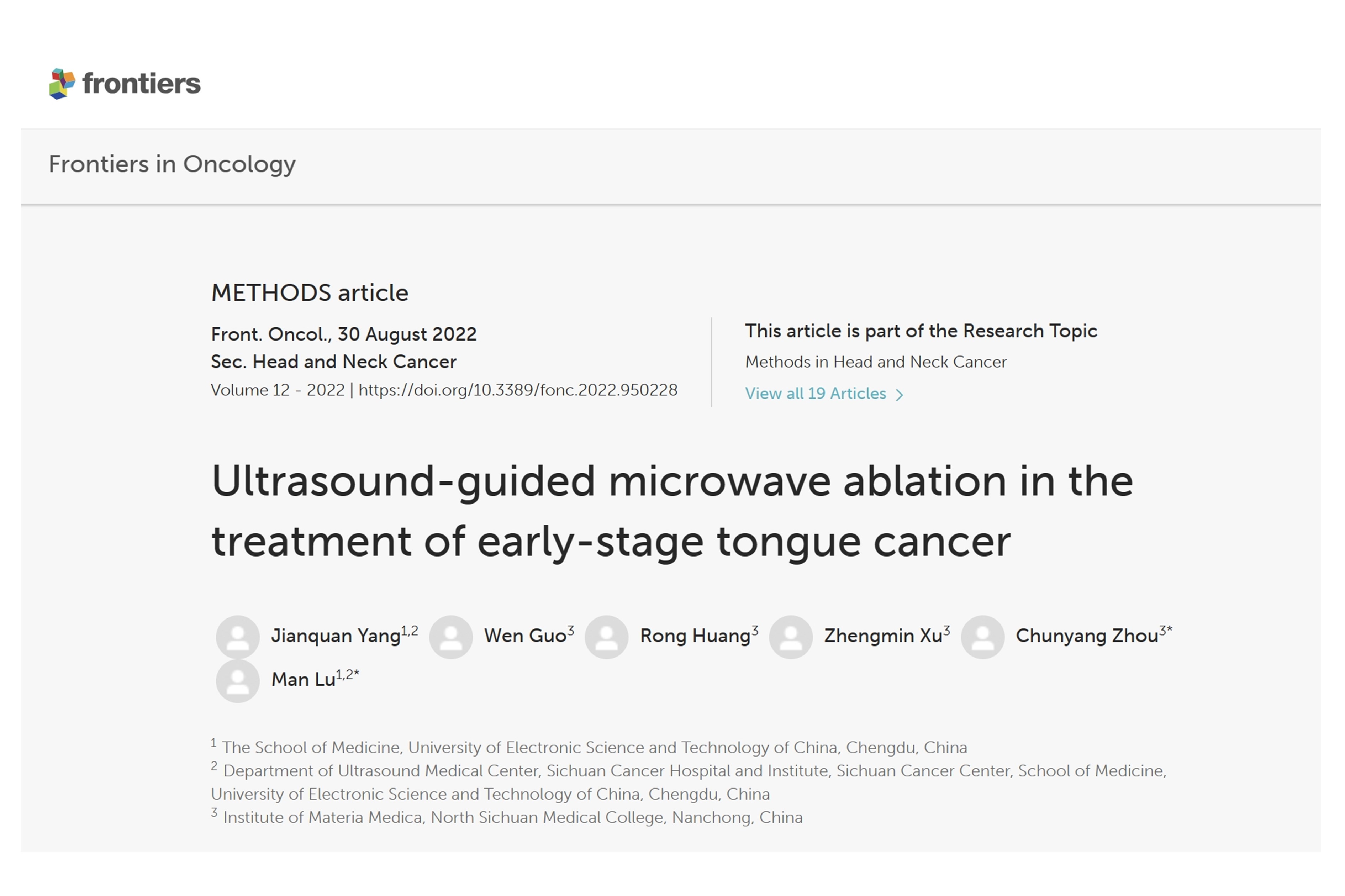第一例使用超聲引導微波消融治療早期舌癌(early-stage tongue cancer, 簡稱ESTC)的病例。超聲引導微波消融可用于治療早期舌癌,可完全消融腫瘤并保留舌部功能,進一步提高患者的生活質量。