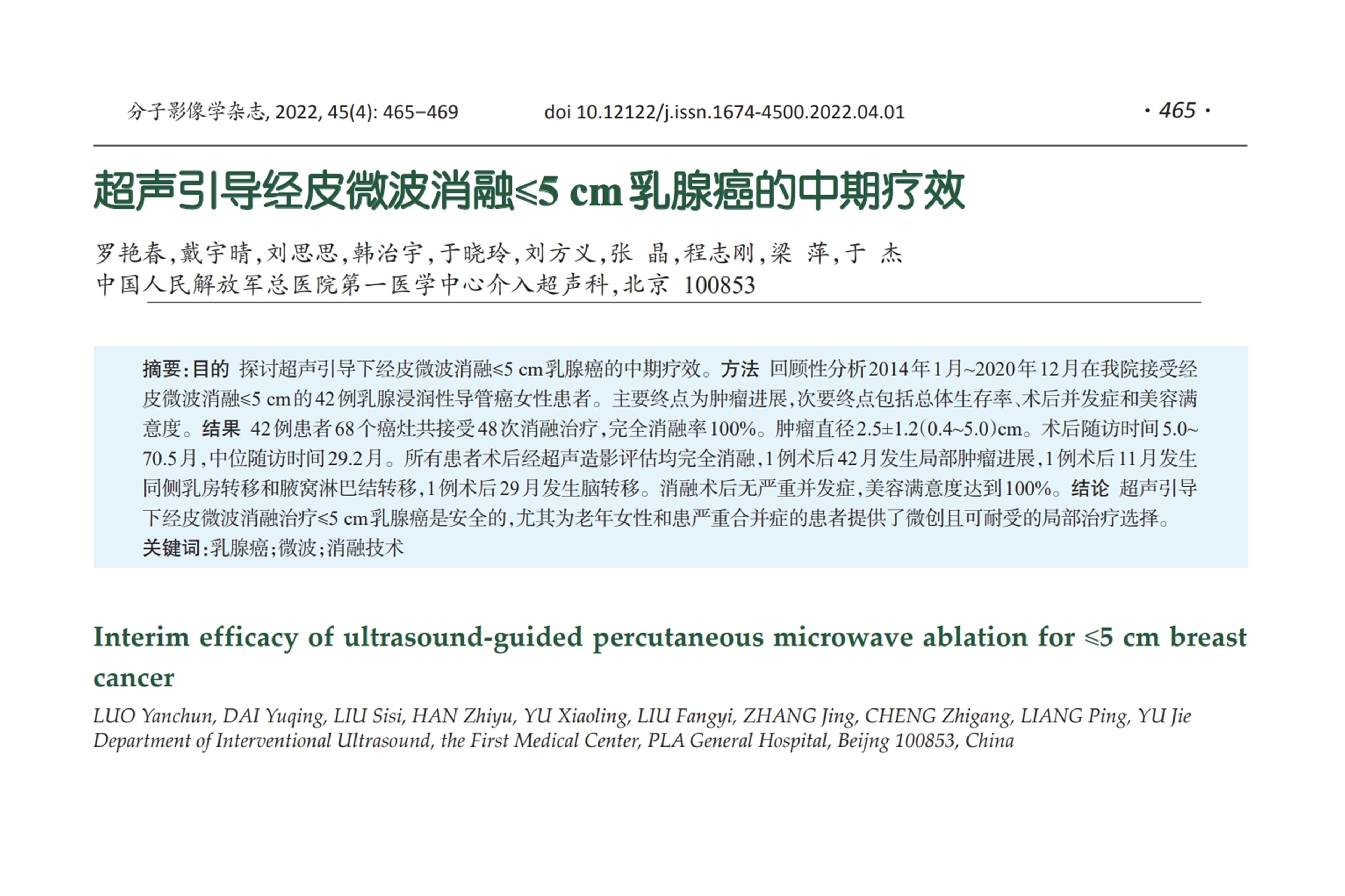 超聲引導下經皮微波消融治療 ≤5cm 乳腺癌是安全的,尤其為老年女性和患嚴重合并癥的患者提供了微創(chuàng)且可耐受的局部治療選擇。